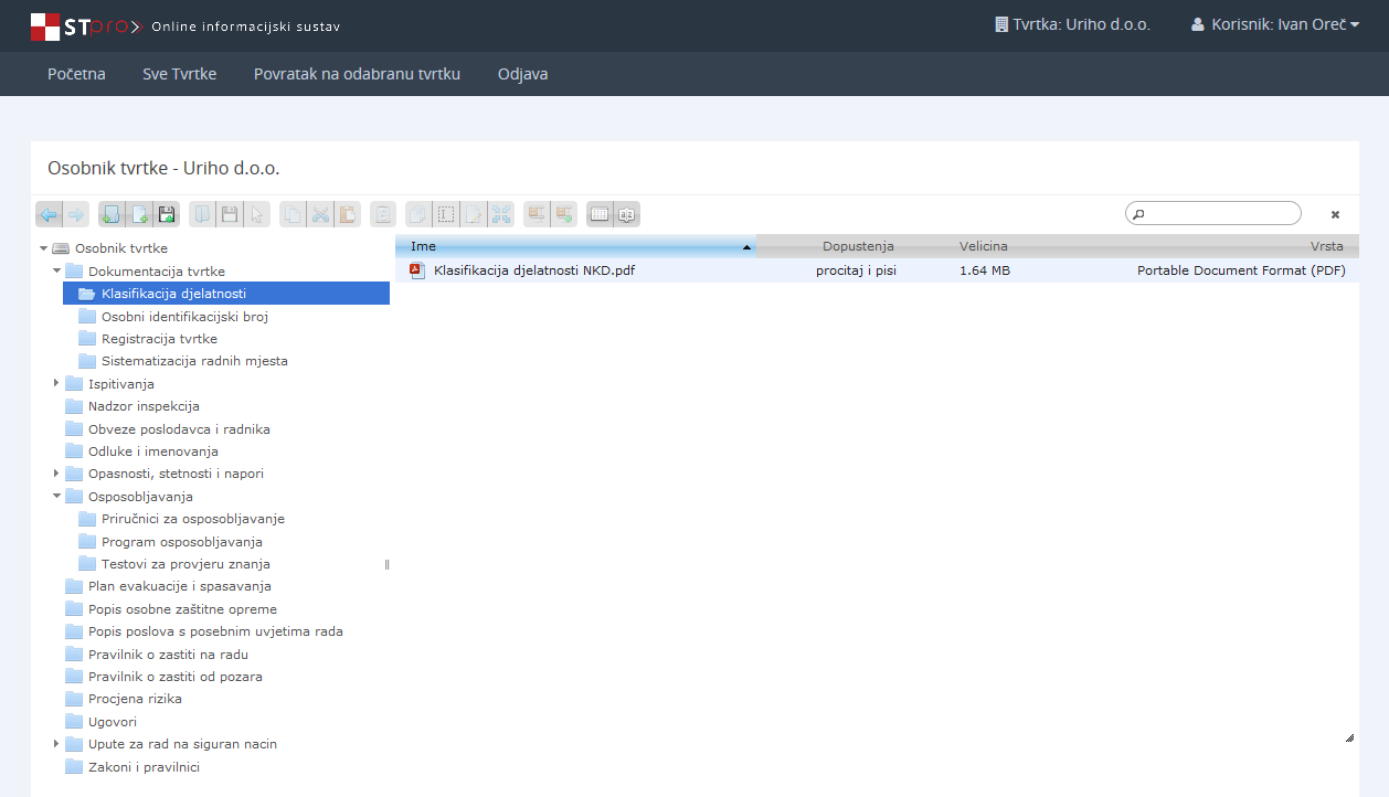 Modul osobnik tvrtke na jednom, centralnom mjestu sadrži sve važne dokumente poslodavaca vezane za tvrtku, zaposlenike, strojeve, instalacije te sve druge dokumente koje želite imati na centralnom mjestu. Dokumenti mogu biti u PDF, MS Word ili Excel formatu, slike i li bilo koji drugi format datoteke.